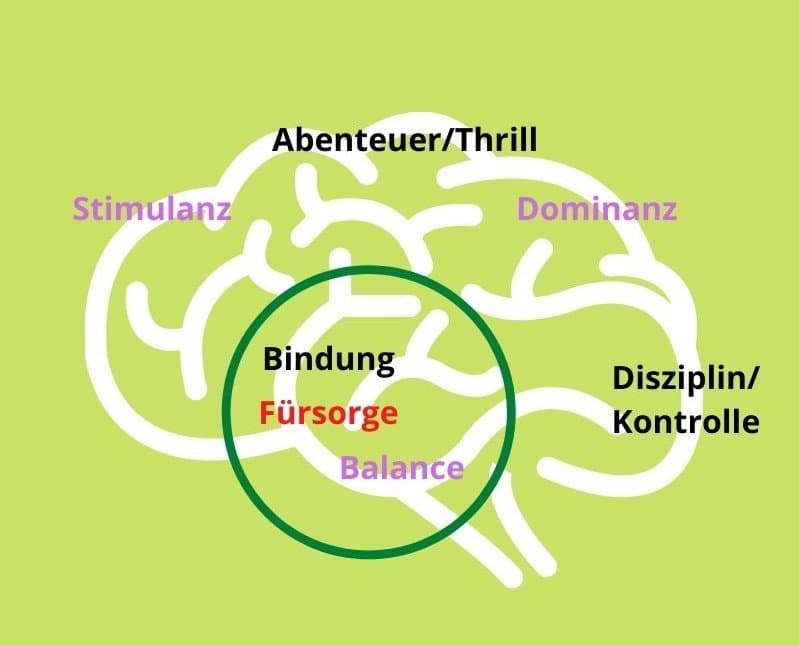 Im Balance-System: Bindung – die Suche nach Anschluss, die Sicherung des Überlebens der Nachkommen und der Wunsch nach persönlicher Betreuung und Hilfe. Fürsorge – die Sicherung des Überlebens der Nachkommen auf Seite der Mutter, die auch auf Haustiere übertragen wird.
